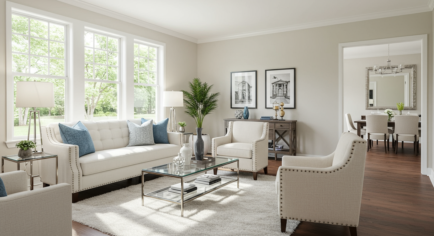 This is the time to start getting ready for showings and moving. If you have furniture that isn’t making the move, go ahead and donate it now. Or, if you have prized antique pieces, this might be the time to put them in storage. Either way, clear out some furniture and pare down to just the essentials. The goal is to make your rooms feel large and spacious, but not empty. Leave a few pieces in each room to show scale, which is important for the photographs.